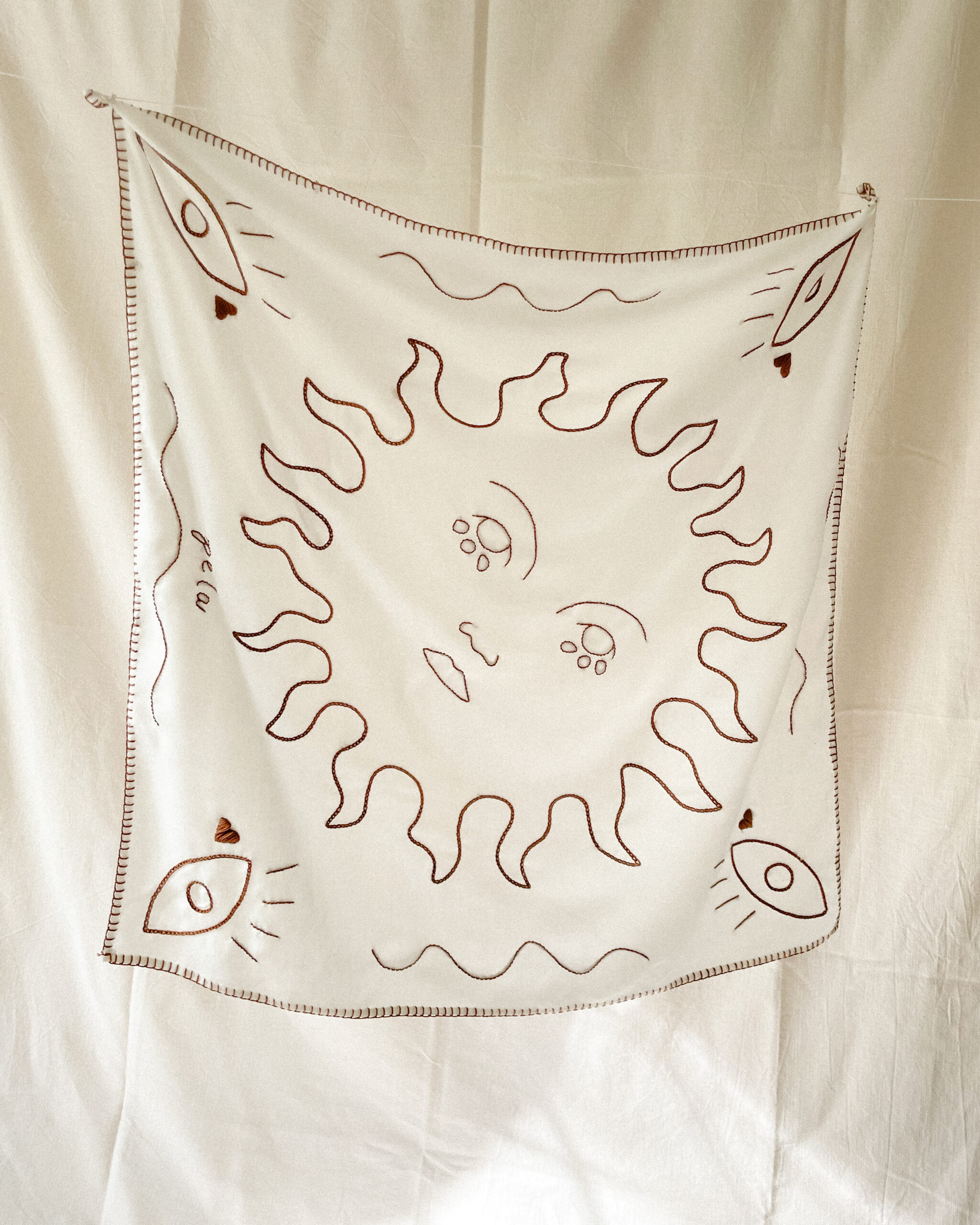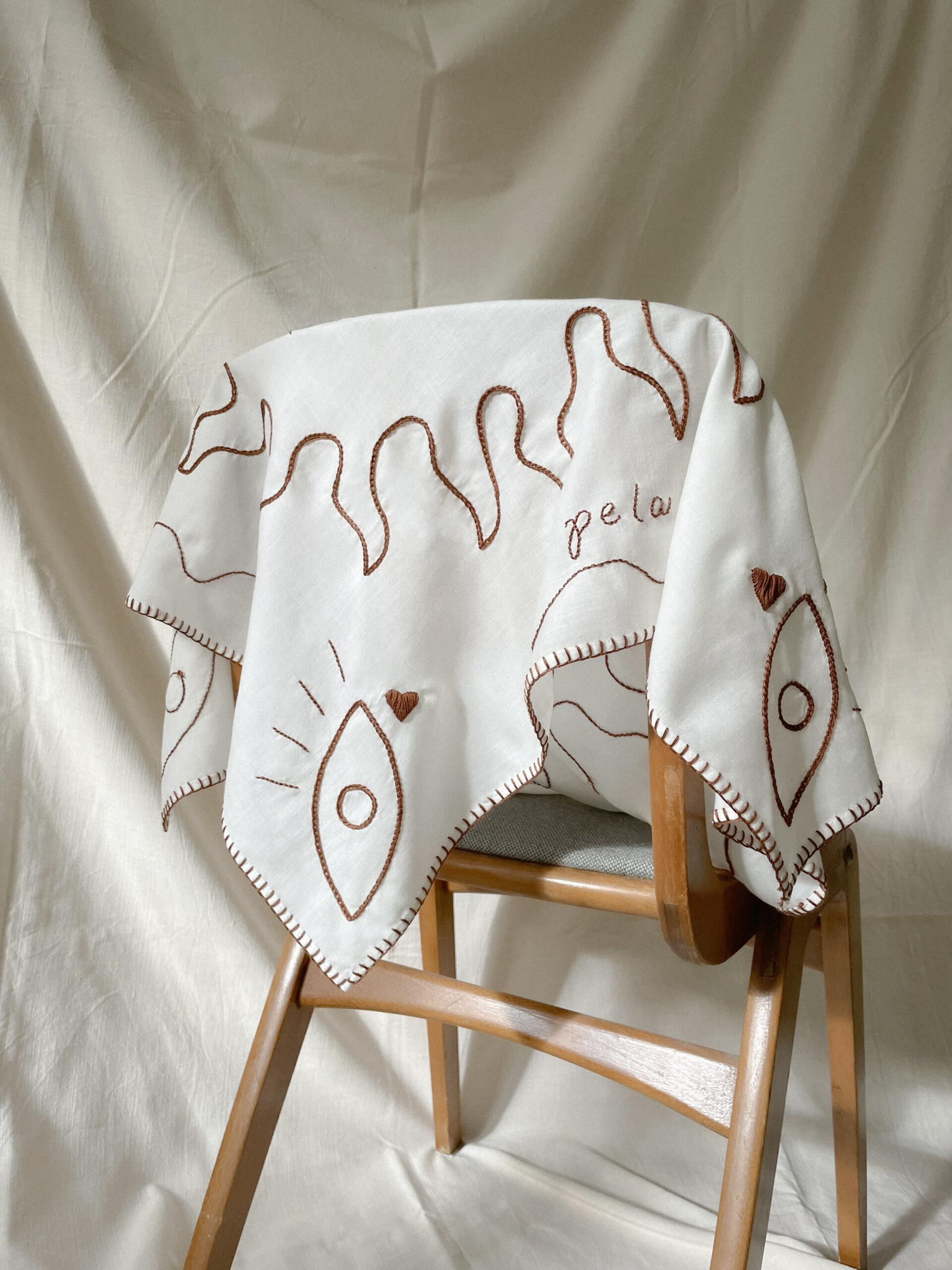 Dostępna w wymiarze 70×70, wyhaftowana ręcznie brązowo-rdzawą nicią, na zwiewnej, cienkiej wełnianej tkaninie. Każda chusta jest numerowana a do niej dołączany certyfikat autentyczności.